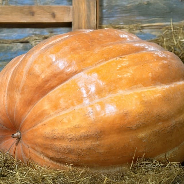 A deep orange 20-35 lb pumpkin with thick flesh and a 4″ long by 3″ diameter handle. An excellent market pumpkin.