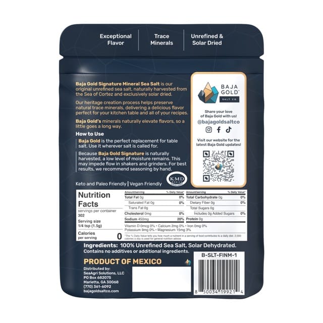 Naturally harvested from the Sea of Cortez, Baja Gold Fine Grind delivers pure, unrefined flavor with essential trace minerals that preserve the ocean’s vitality. Our smallest grain size, milled to a flour-like texture, is perfect for daily kitchen use- ideal for seasoning, sautéing, and baking. Certified Kosher and compatible with Keto, Paleo, Vegan, Gluten-Free, and GMO-Free lifestyles.