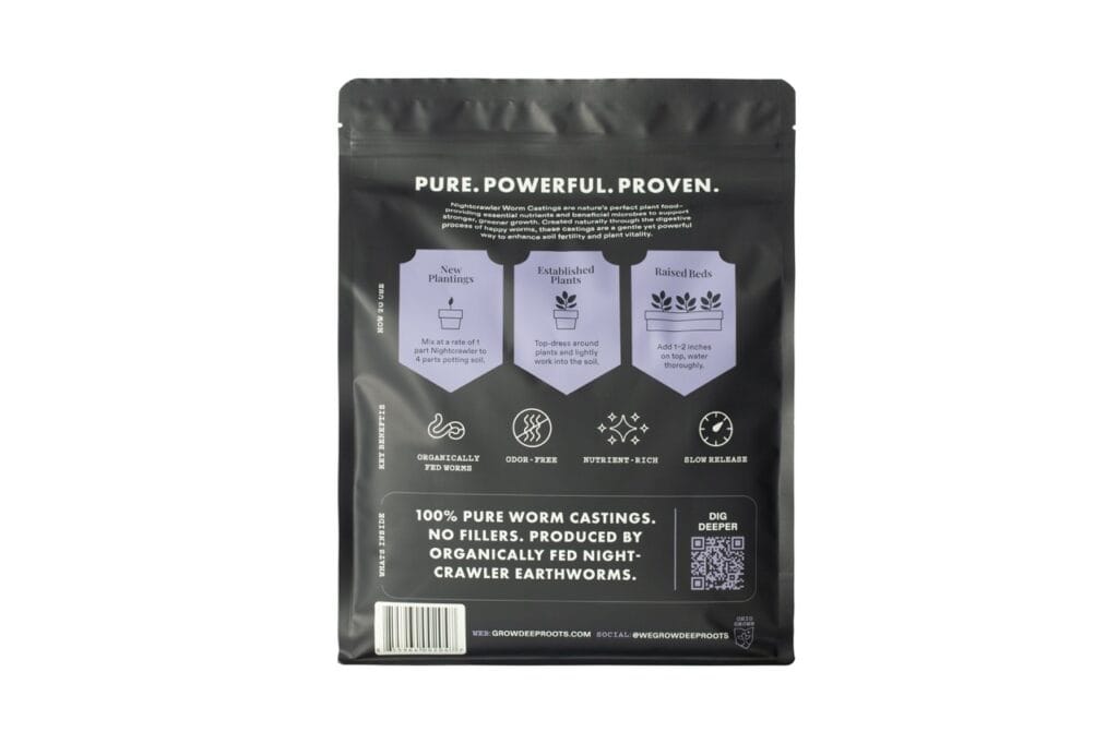 100% pure worm castings crafted to enrich soil with living microbes, organic nutrients, and beneficial fungi that promote vigorous root growth and long-term soil health. Ideal for gardens, potted plants, and organic growing, Nightcrawler Castings provide a slow-release boost that enhances soil biology and supports strong, resilient plant growth.