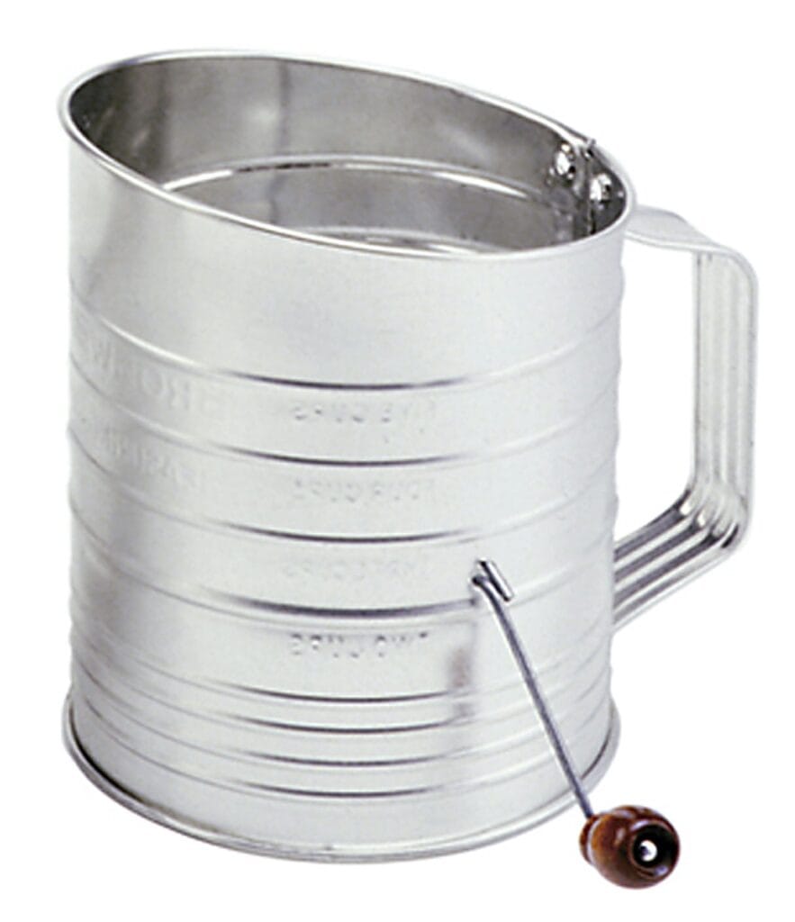 5 cup capacity. Traditional top-quality hand crank sifter for sifting flour, powdered sugar, etc. Stainless steel.