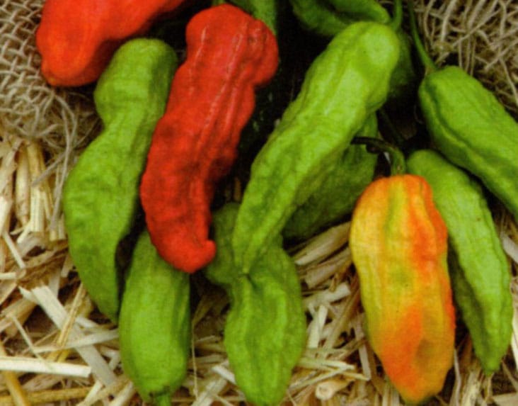 If you want to grow ‘em hot, try this one. With a 1,000,000+ scoville rating, these wrinkled green to red fruits should be handled with care. Needs warm 85-90° temps and 2-3 weeks to germinate, but it is fun to grow.