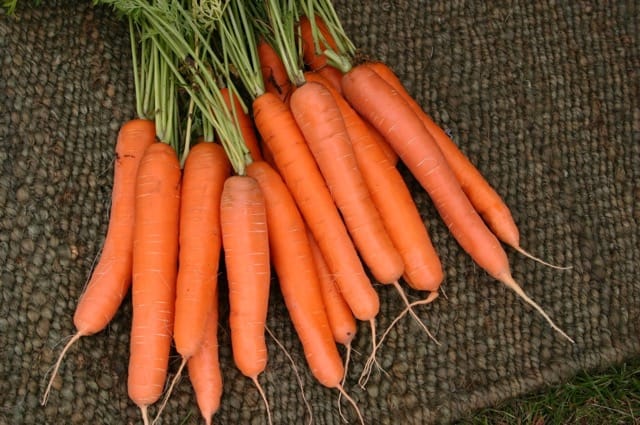 Dark orange, high quality carrot, uniform 8″ x1 1/2″ in diameter roots, slight taper from top to bottom, excellent sweetness and flavor; tender-crisp and coreless.