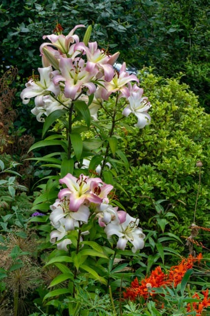 Ht . 5-7’ . Known for its sturdy stalks and large, fragrant blooms, this lily variety makes an excellent cut flower for arrangements. Each lily bulb can have as many as 20-30 blooms by the third year. Its strong stems provide reliable support, even in windy conditions.