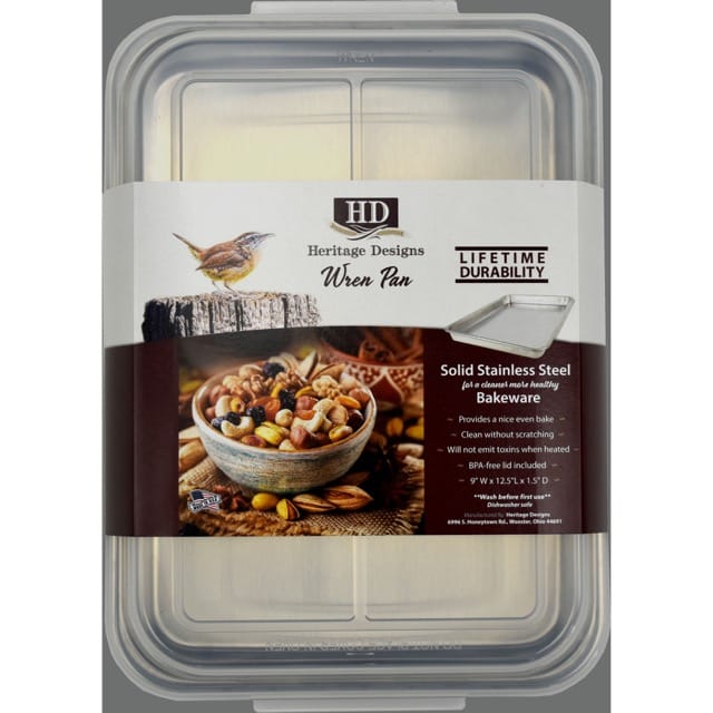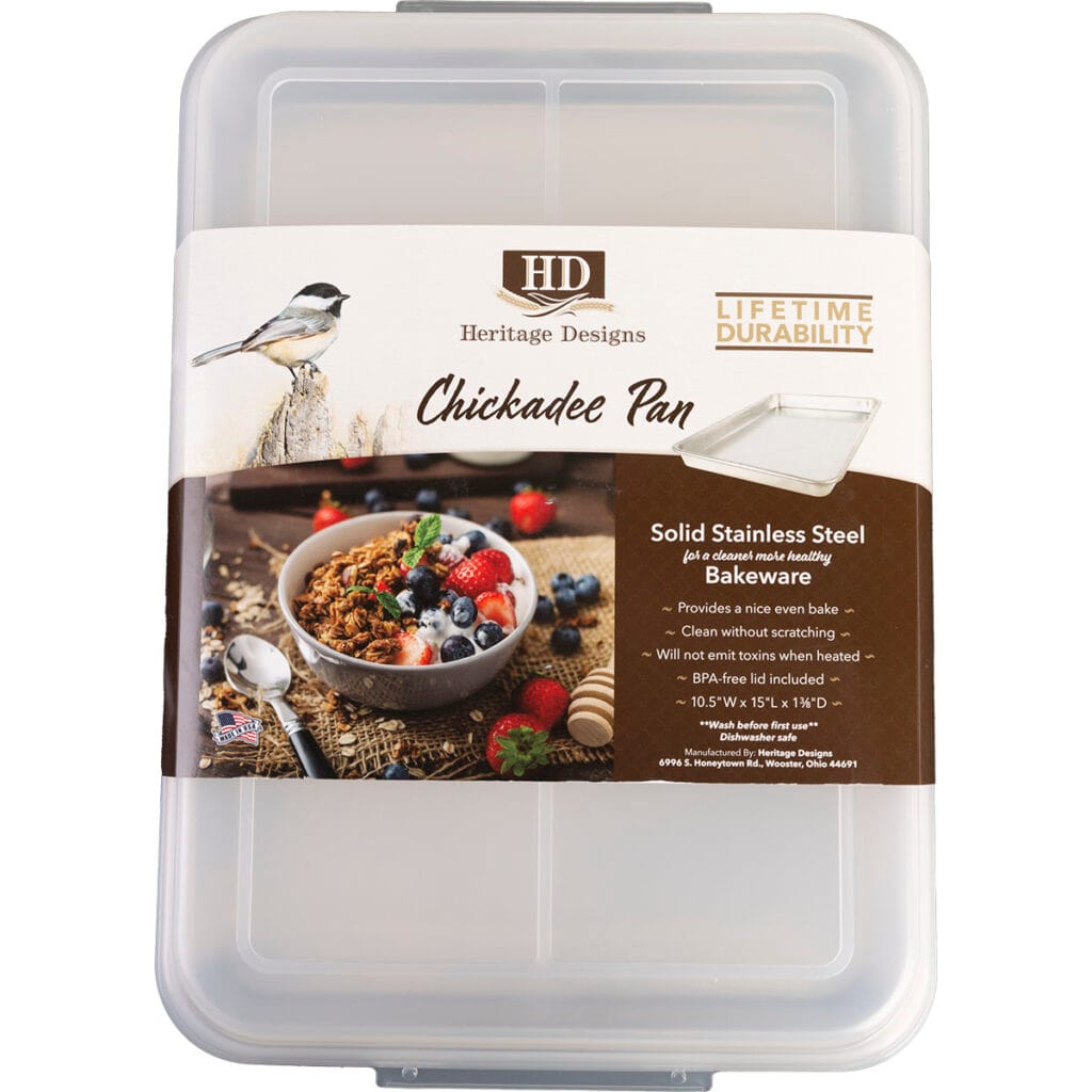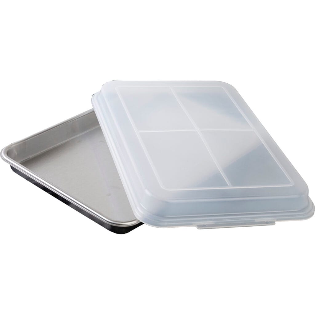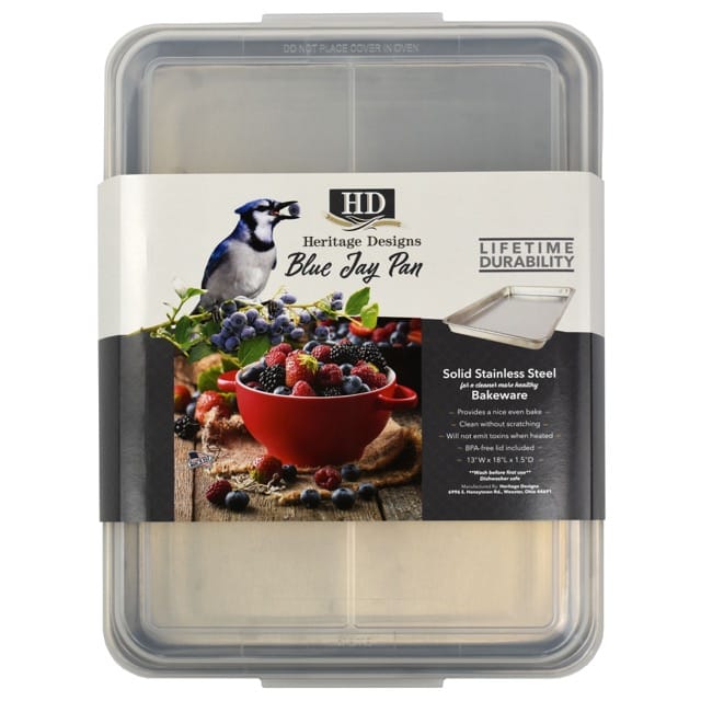 These all-stainless steel cookie sheets provide a cleaner and healthier alternative to aluminum and will not emit toxins when heated. Provides a nice, even bake, perfect for cinnamon rolls and desserts. Includes clear BPA-free lid. Made in USA.