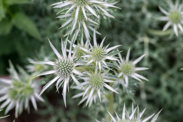 Eryngium ‘White Glitter’ has long, sturdy stems and attractive blooms that exhibit a metallic white shine. The plant tolerates hot, sunny locations and attracts bees, beneficial flies, and wasps. This is a taprooted plant that transplants poorly and is best left undisturbed once established. It is an excellent choice for both cut and dried flower arrangements.